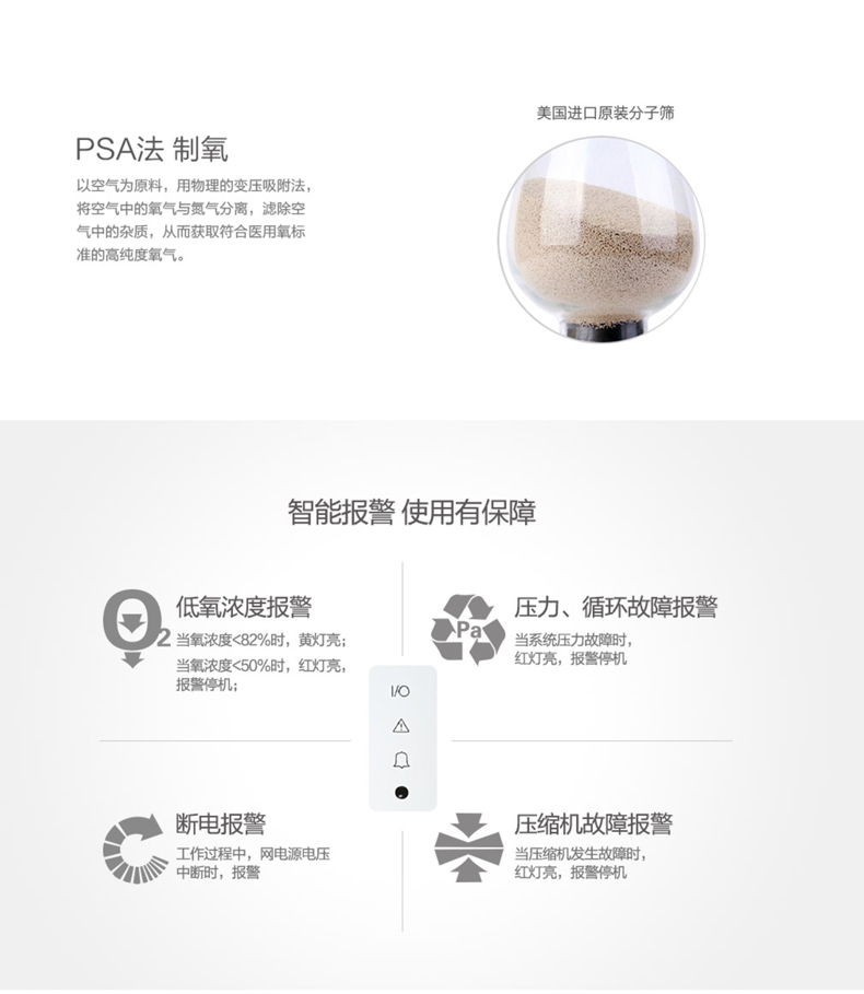 以空氣為原料,用物理的變壓吸附法,將空氣中的氧氣與氮?dú)夥蛛x,濾除空氣中的雜質(zhì),從而獲取符合醫(yī)用氧標(biāo)準(zhǔn)的高純度氧氣。